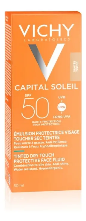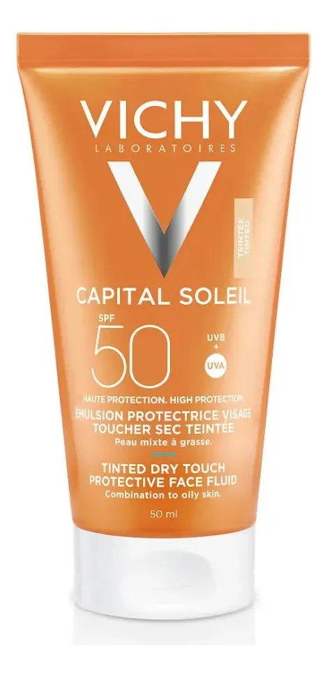 Protector Solar Facial Vichy Capital Soleil Fps 50 De 50ml es un protector solar con color que proporciona alta cobertura gracias a las texturas BB, unificando la piel para lograr un tono homogéneo y un bronceado natural. Ideal para mujeres con piel mixta a grasa. Su fórmula hipoalergénica ha sido testada bajo control dermatológico y está enriquecida con Agua Termal de Vichy, conocida por sus propiedades calmantes, fortalecedoras y regeneradoras. Modo de uso: – Aplicar la Emulsión de tacto seco con color justo antes de la exposición al sol. – Renovar la aplicación de manera frecuente y abundante, en especial después de haber nadado, transpirado o secado con una toalla.